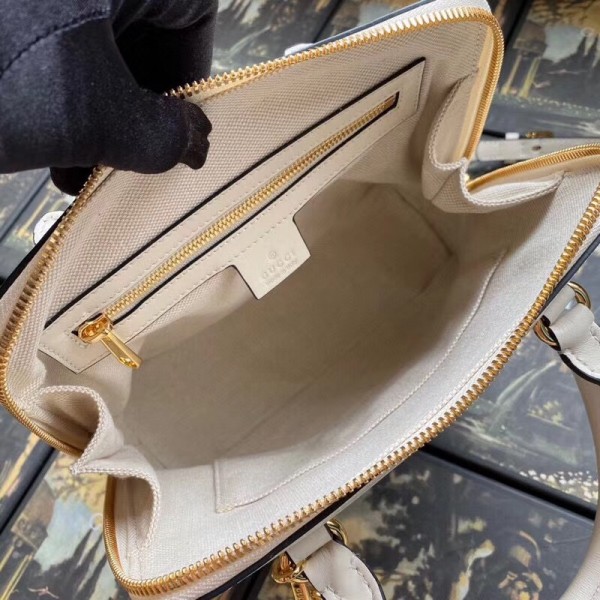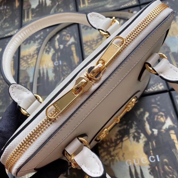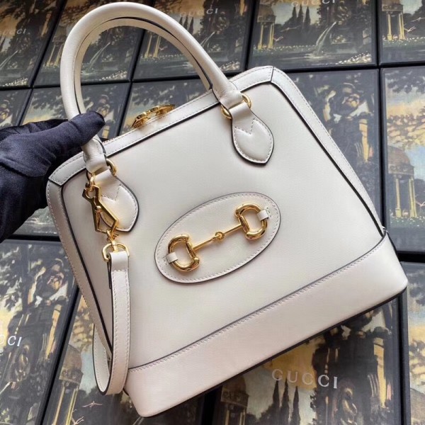 A new silhouette introduced to the Gucci 1955 Horsebit line for Spring Summer 2020, the top handle has a domed shape with an optional leather shoulder strap, crafted from white leather. The collection unifies details first introduced on the original bag that inspired the line from over six decades ago with a modern spirit, highlighting the Horsebit. Part of Gucci’s genetic code, the double ring and bar design has been established as one of the most distinctive elements among the House symbols borrowed from the equestrian world.