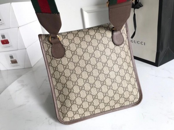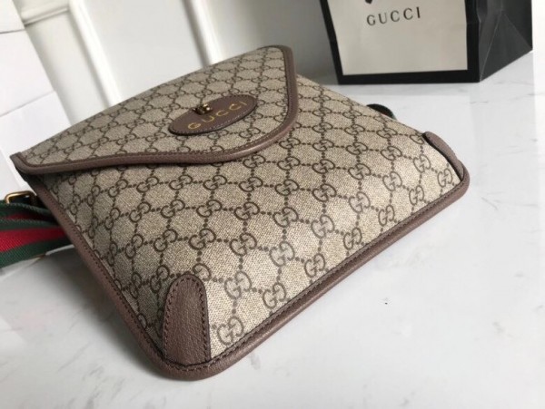 The medium messenger bag is part of a collection of vintage inspired leather accessories in GG Supreme featuring an oval leather tag with metal feline head, a now-established code of the House. The slim design has a magnetic flap closure and is completed with an adjustable nylon strap featuring the House Web colors.