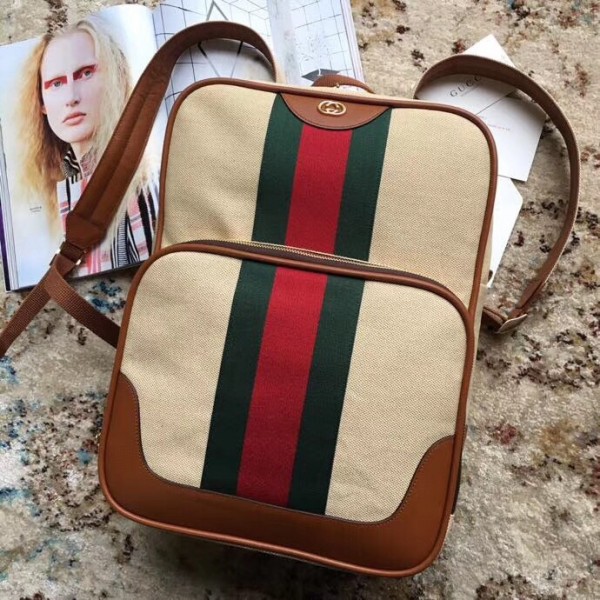 The classic backpack shape blends vintage appeal with traditional House codes in a softly structured shape. The distinctive Web is presented against beige canvas—a bi-colour woven fabric with a slight aged effect that enhances a vintage appearance. The rectangular shape is trimmed with leather and a small Interlocking G in gold-toned metal. New shapes and signature Gucci lines are reimagined in a mix of fabrics and trims imbued with an inherently summer feel.