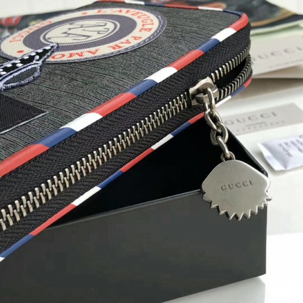 The concept of travel continues to be a source of inspiration for the House. The Gucci Courrier collection—introduced in Pre-Fall 2017—is updated in black and grey GG Supreme canvas. The GG motif is enriched with a blend of contemporary embroideries—like the UFO—and vintage inspired details, including airmail trims and a Gucci print. The appliqués are individually embroidered and then skillfully hand-applied to each piece by specialized artisans. This process ensures that no two items will be alike, giving each a one-of-a-kind appearance.