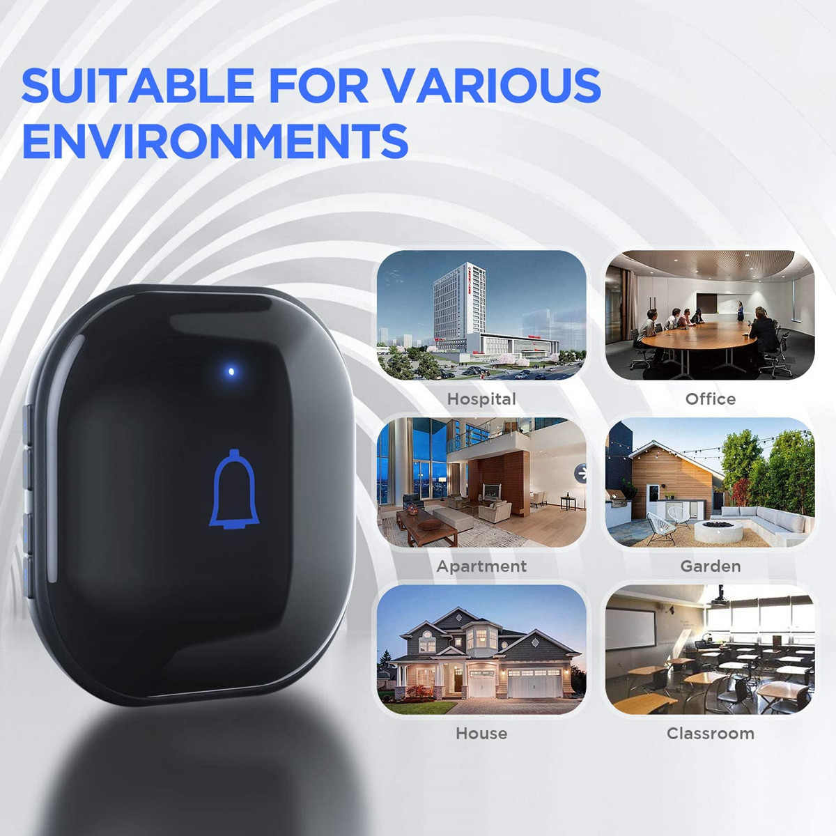 The door bell ringer wireless with a reliable wireless range of 1,000ft/300m in open area and strong signal penetration, the doorbell will never fail to alert you when someone shows up at the door.The doorbell wireless is the best choice for homes ,classroom, office and any other occasions.