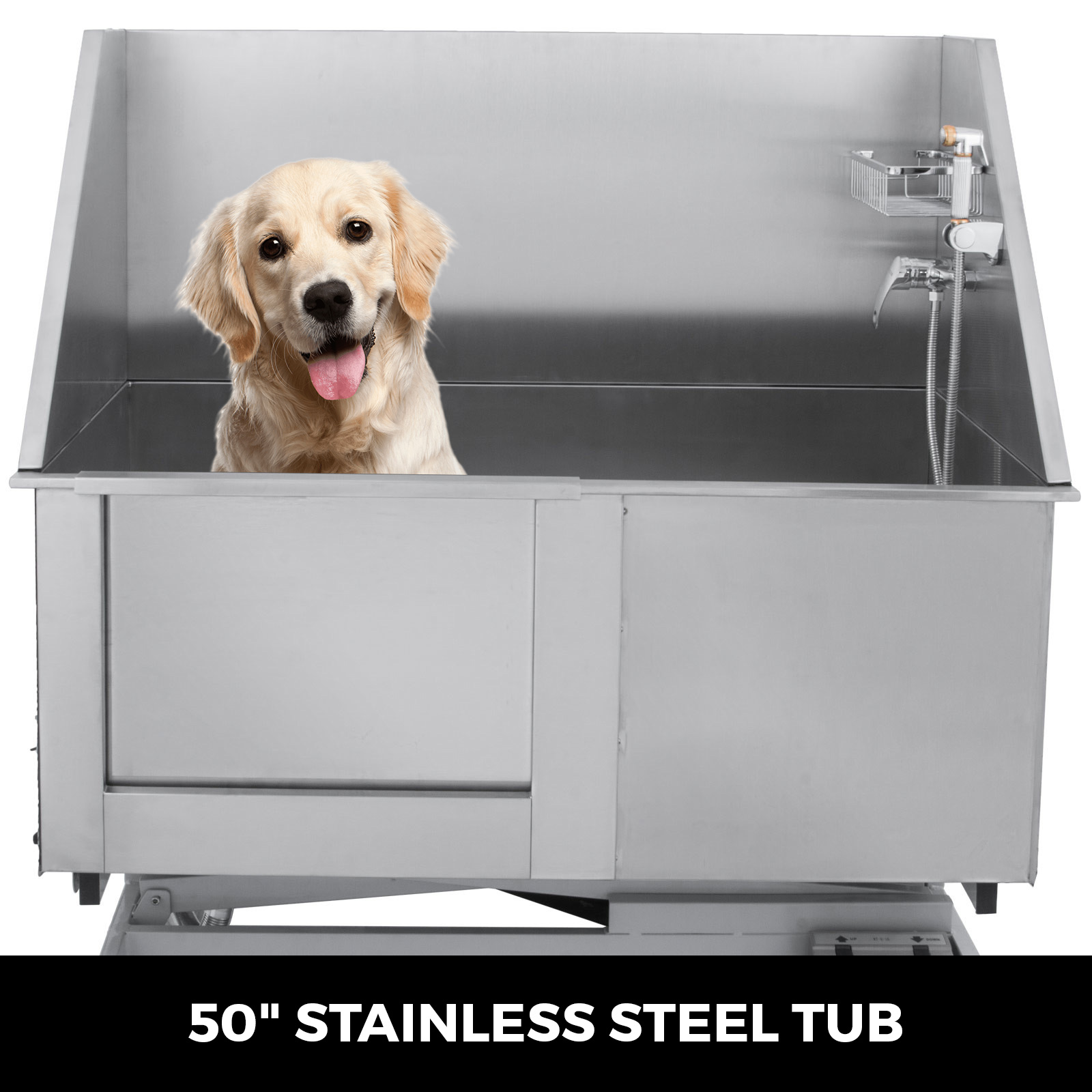 This dog bathing tub is equipped with electric motor for steadily height adjust(range:53-73"). Just step the "up" & "down" pedals at bottom, it will auto stop at any height you want.