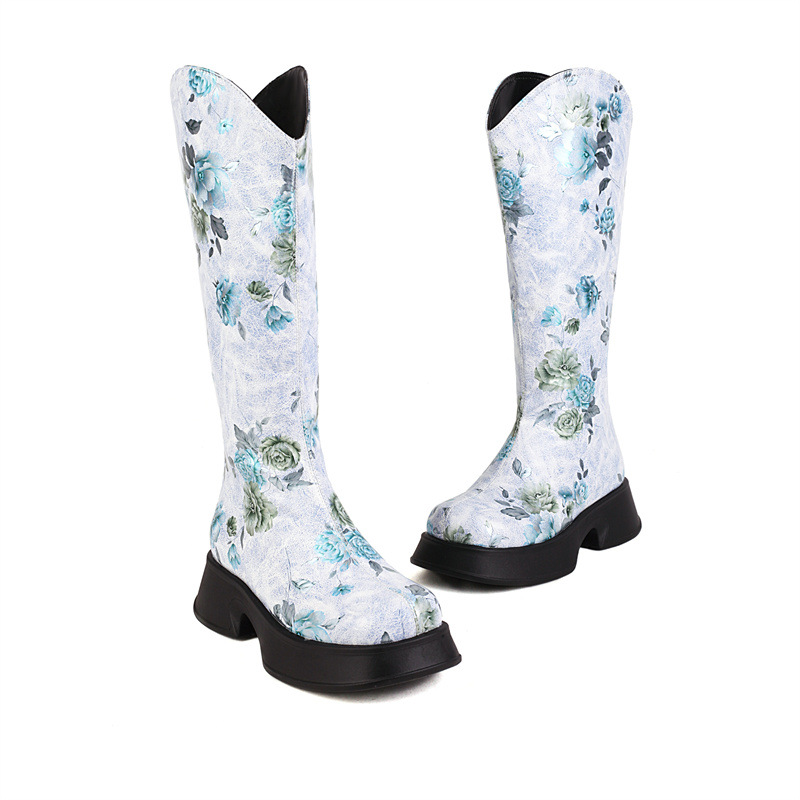 Women Boots 2022 Trend Luxury Winter Retro Round Head Small Platform Women Shoes Casual Mid Heel Print Ladies Knee High Boots