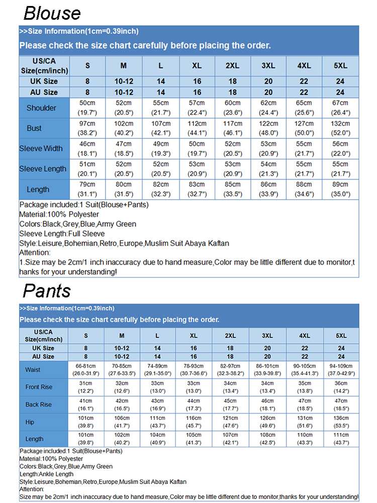 Package included:1 Suit(Blouse+Pants) Material:100% Polyester Colors:Black,Grey,Blue,Army Green Sleeve Length:Full Sleeve Neckline:O-Neck Pattern:Solid Color Length:Ankle Length Waistline:Elastic waist Thickness:Thin Decoration:Side Pockets Features:Puff Sleeve Style:Leisure,Bohemian,Retro,Europe,Muslim Suit Abaya Kaftan Season:Spring,Summer,Autumn,Winter Occasion:Family,Party,Beach,Wedding,Holiday,Employment Label: Yes Attentions: 1.The Real Object May Exist Slightly Colors Differences Compared To Images As Different Computers Display.Caution If Minding,Thanks. 2.There Might Be A Manual Measuring 1-3 cm Error.Sorry For Any Inconvenience. 3.Please Prevail On Real Item, Model Images For Reference Only. 4.Attention!!!Please check the size chart carefully before placing the order.