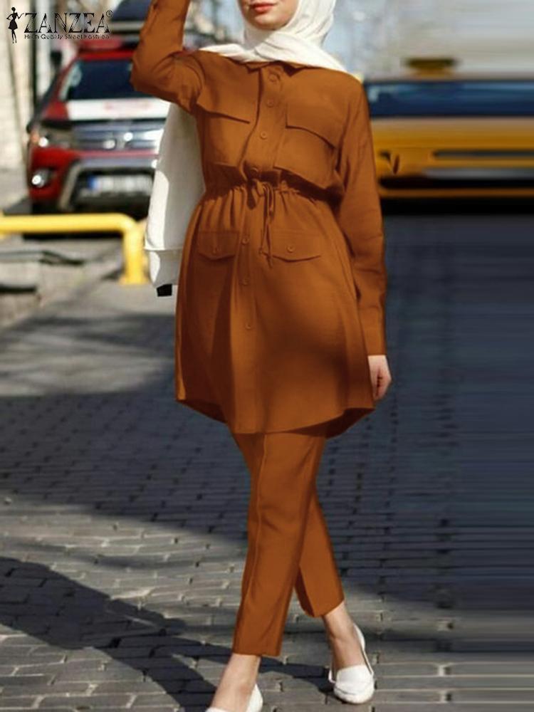 Package included:1 Suit(Blouse+Pants) Material:35% Polyamide+65% Rayon Colors:Navy,Army Green,Caramel Colour Sleeve Length:Full Sleeve Neckline:Turn-Down-Collar Pattern:Solid Color Length:Ankle Length Buckle chain:Button Down Front,Button Cuffs Waistline:Elastic waist Thickness:Thin Decoration:Front Pockets Features:Draw string waist Style:Leisure,Bohemian,Retro,Europe,Muslim Suit Abaya Kaftan Season:Spring,Summer,Autumn,Winter Occasion:Family,Party,Beach,Wedding,Holiday,Employment Label: Yes Attentions: 1.The Real Object May Exist Slightly Colors Differences Compared To Images As Different Computers Display.Caution If Minding,Thanks. 2.There Might Be A Manual Measuring 1-3 cm Error.Sorry For Any Inconvenience. 3.Please Prevail On Real Item, Model Images For Reference Only. 4.Attention!!!Please check the size chart carefully before placing the order.