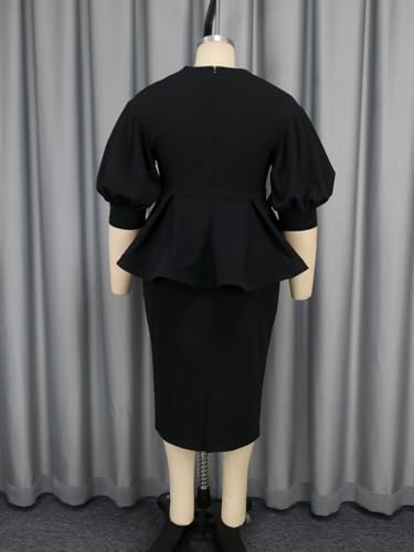 - Black 2 piece skirt suit for women for church includes a peplum top and a bodycon skirt.