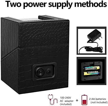 The watch winder can be powered by either AC adaptor or 2 batteries (AA)(Not included). Use the adapter at home to keep running perfectly. The battery device design of the watch winder allows you to use it at any time during the journey and is convenient to carry.