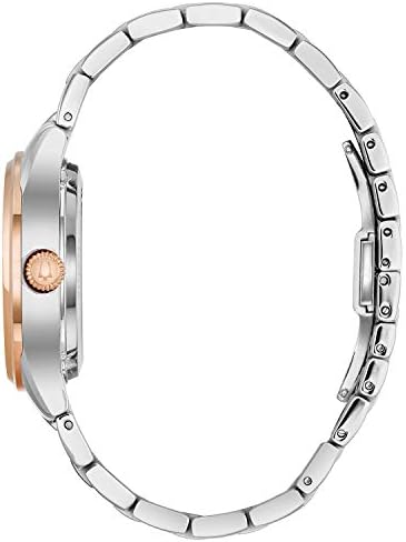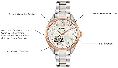 Brand, Seller, or Collection Name Bulova Model number 98P170 Part Number 98P170 Item Shape Round Dial window material type Sapphire Crystal Display Type Analog Clasp Push Button Deployment Clasp Metal stamp no-metal-stamp Case material Stainless Steel Case diameter 35 millimeters Case Thickness 11 millimeters Band Material Stainless Steel Band size Womens Standard Band width 15 millimeters Band Color Two Tone Dial color White Bezel material Stainless Steel Bezel function Stationary Calendar No Calendar Special features Open Aperture, Hearbeat, Hack feature Movement Japanese Automatic Water resistant depth 100 Feet Warranty Manufacturer’s warranty can be requested from customer service. Click here to make a request to customer service.