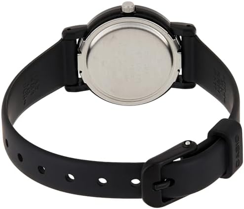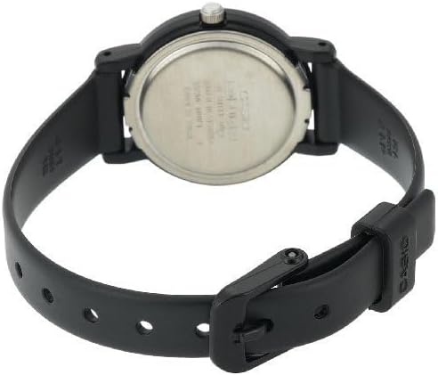 Taking cues from classic design, the quartz-powered Casio Women's Black Casual Classic Analog Watch #LQ139A-1B3 features a dramatic black dial face, which is encased by a durable mineral dial window and embellished with contrasting Arabic numerals and indexes for a stand-out effect. The black resin band comes equipped with a sturdy buckle closure and provides a sleek edge. Other details include a 26-millimeter resin case and a stationary, resin-and-stainless steel bezel. With its combination of classic lines and modern touches, this stunning timepiece makes a versatile everyday accessory.