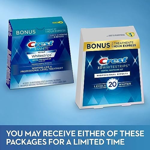 Want to your whiten teeth at home? Crest 3DWhitestrips Professional Effects + 1 Hour Express bonus offering is designed to whiten like a professional-level teeth whitening treatment at-home. The Advanced Seal Technology�s comfortable, no-slip grip means the strips stay put until you take them off, allowing you to talk and even drink water while whitening your teeth. Made by the #1 dentist-recommended at-home teeth whitening brand, Crest 3DWhitestrips Professional Effects will give you a 100% noticeably whiter smile, guaranteed. Using the same hydrogen peroxide whitening ingredient as dentists, this enamel safe at-home teeth whitening kit will make your teeth 20 levels whiter. Simply apply 20 treatments of Crest 3DWhitestrips Professional Effects for 45 minutes a day and 2 treatments of 1 Hour Express for 60 minutes. This pack includes 44 teeth whitening strips, 22 for your top teeth and 22 for your bottom teeth, to be used over the course of 22 days.