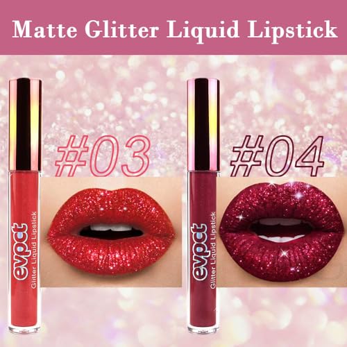 evpct 2Pcs Ruby Red & Dark Red Matte to Glitter Liquid Lipstick Long Lasting Lip Set Kit for Women Diamond Shiny Glitter Sparkly Glossy Metallic Shimmer Sparkle Waterproof Lipstick Lip Gloss 03+04