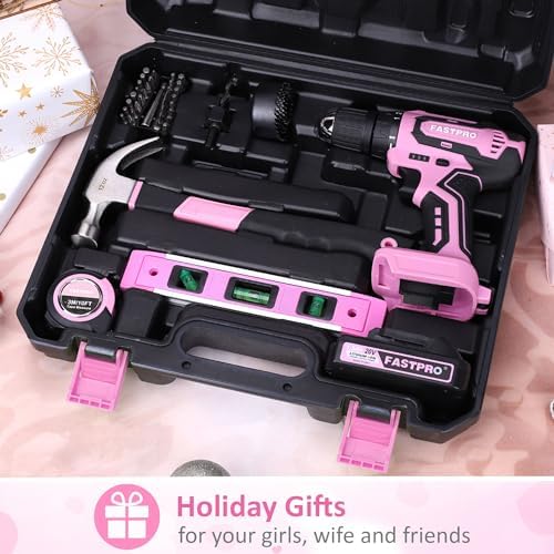 FASTPRO pink drill kit with cordless 20V lithium-ion drill driver contains almost every basic hand tools you need for work and DIY projects around the house.