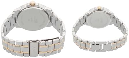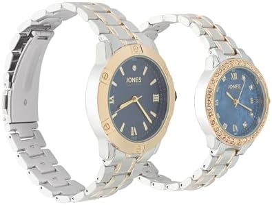 The Jones New York shiny two tone couple watch is a perfect companions for both formal occasions and everyday wear. For the discerning gentleman, the men's variant boasts a robust yet sleek 42mm case diameter, exuding masculinity and strength. Its dial, measuring at 34mm, features sophisticated roman numerals and index hour markers, ensuring utmost precision in timekeeping. Encased within a round-shaped case with a shiny silver finish, the navy sunray dial adds a touch of understated luxury, while the shiny gold color bezel complements the two-tone metal strap, creating a harmonious aesthetic. With a band width of 22mm & a case thickness of 10mm, this watch exudes confidence and refinement with every glance. The fold-over clasp ensures a secure and comfortable fit. Engraved with the iconic Jones New York brand name beneath the 12 o'clock position, this timepiece is a testament to superior craftsmanship and timeless style. For the elegant lady, the women's variant embodies grace and sophistication with a delicate 34mm case diameter and a 27mm dial adorned with roman numerals and crystal hour markers. The shimmering crystals encrusted in the bezel add a touch of glamour and allure. The navy sunray dial, complemented by the shiny silver and shiny gold two-tone metal strap, exudes timeless beauty and sophistication, perfect for the modern woman with discerning taste. With a band width of 16mm and a case thickness of 8mm, this watch is delicately proportioned to adorn the wrist with elegance and poise. The fold-over clasp ensures a secure and comfortable fit, allowing the wearer to exude confidence with every movement. With a total length of 7.5 inches, this exquisite timepiece is designed to accentuate the femininity and grace of the modern woman, making it the perfect accessory for any occasion. Whether worn as a symbol of love and commitment or as a statement of personal style, these watches are sure to captivate hearts, leaving a lasting impression wherever they go.