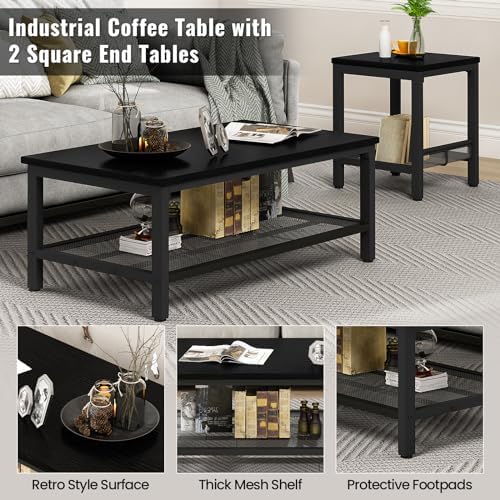 Industrial Coffee Table with 2 Square End Side Tables