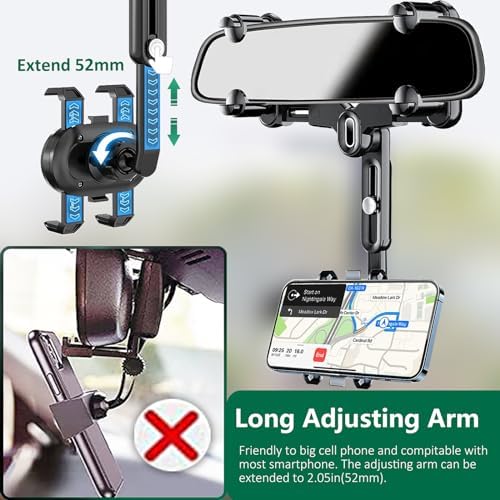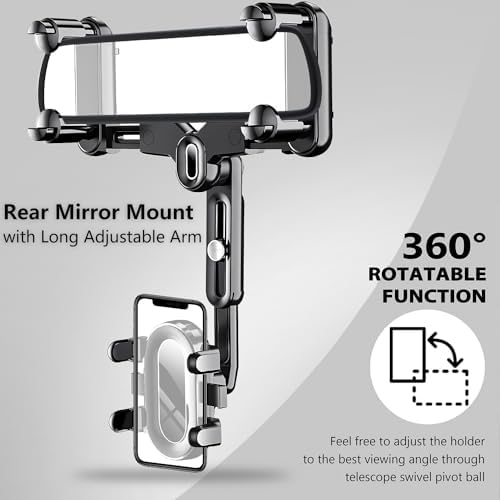 - The rear view mirror phone mount has a 360° rotating design, you can place your phone at any angle you want. Arm length can be shortened or extended(0-2inches), it can be adjusted without blocking the view.