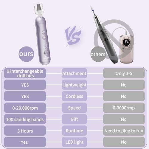 Professional Manicure and Pedicure Set: This electric nail file is design for hand and foot care, can be used for all-around shaping, buffing, grinding, polishing, cuticle, hard skin, callus removing. perfect manicure kit for women trimming, grinding and polishing natural nails and toe nail grinder kit for thick nails. You will enjoy this manicure pedicure tool kits !!! RECHARGEABLE Nail File : With a large battery capacity (2000mAh) rechargeable battery, you can use this Electric nail drill machine to do hand and foot care at anywhere anytime. Type C USB Cable included , Being fully charged this for about 4hours, the electric nail file will work up to 3 hours. Cordless & Portable: If you tired of messy cords and heavy Power Machine, Then your search stop !!! Hoxida Cordless nail dril machine is lightweight, and portable with you wherever you go, Professional for home salon use, or travel , you can do a spa hand and foot care experience at anytime anywhere you want. Low Noise, Low Heat : Hoxida manicure and pedicure tools kit is built to last, with a powerful yet quiet motor with smart heat dissipation, keep the pedicure drill machine is in low noise, low heat while using it. a perfect home pedicure manicure kit for doing your own mani and pedi. Easy to use, Even for Beginner: This electric manicure pedicure kit have 5 adjustable speed 0-20,000rpm and designed with forward and reverse rotation directions,choose the appropriate speed and rotation for your needs; ergonomic body design for comfortable holding, speed and direction controlling. Easy to use, enjoy a salon-quality professional manicure pedicure at home. EVEN BEGINNERS CAN USE THIS ELECTRIC NAIL FILE WITH EASE ! What you will get: The Electric Nail Drill Kit comes with 9 interchangeable drill bits,100 sanding bands , dust shield and Type-C charging cable to give your nails a salon-worthy look, this nail kits are the best gift for your nail lovers friends, It's so convenient and you can do a hand or foot care salon privately at home, and everything you need is included.