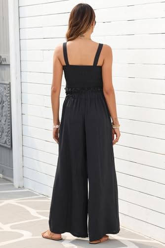 Jumpsuits, Wide Leg Pants, Long Pants, Elastic Waist Tank Top Romper, Two Side Pockets, Solid Color