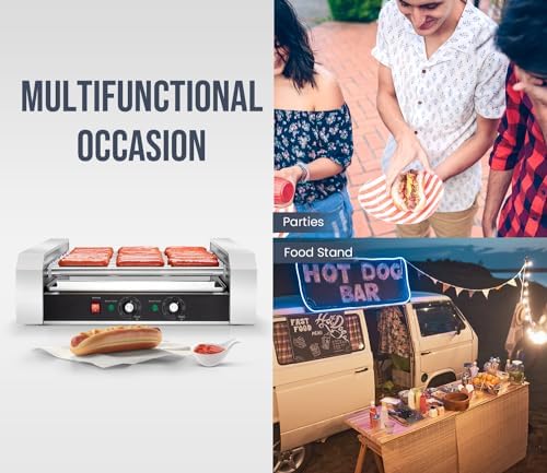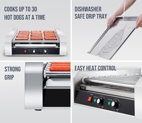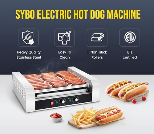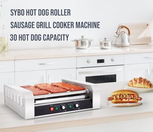 SYBO Hot Dog Roller, 30 Hot Dogs 11 Rollers Grill Cooker Machine with Removable Stainless Steel Drip Tray, 1430-Watts, Ideal for Commercial And Party Use