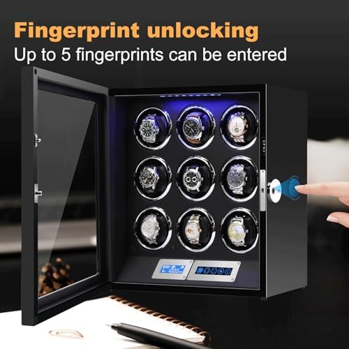 Watch Winder for 9 Slots Automatic Watches with Fingerprint Unlock, Ultra-Quiet Japanese Motors, Built-in LED Illumination and LCD Touchscreen Control