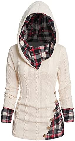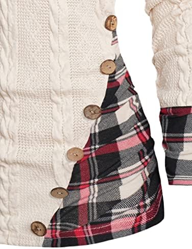 ZEZCLO Women's Twisted Cable Knit Plaid Print Hooded Sweater Mock Button Ruched Shawl Neck Sweater